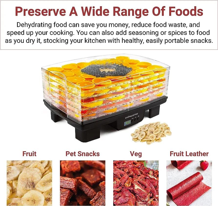 360 ° hot air circulation system and overheating Protection: ensures that the fruit and fruit dehydrator machine is dehydrated in all directions, achieves uniform drying out and greatly reduces dehydration time. Made possible by 400 watts and 360º air flow circulation, the dehydrator has built-in overheating protection, safer.