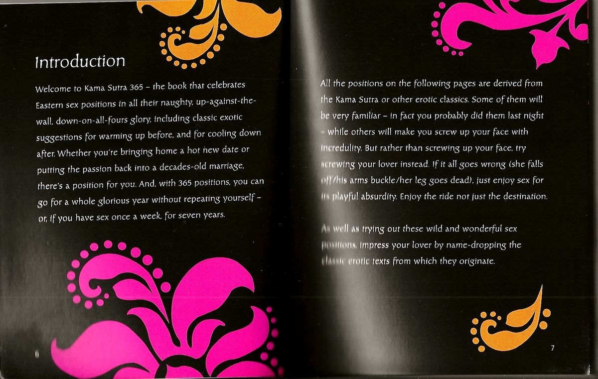 Product Description: This hot little handbook contains 365 different sex positions straight from the Kama Sutra itself, allowing you to try a new position every night of the year!