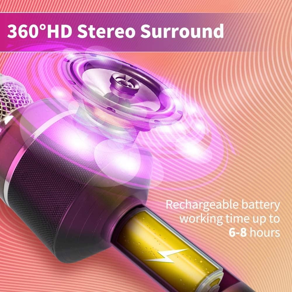 A variety of connection methods meet all your needs. USB charging cable connection, U disk connection, earphone connection, TF card connection. You only need to open the mobile phone's Bluetooth and microphone connection and open the mobile phone APP playback software to listen to music and sing. The microphone comes with a function of canceling the originall sound, so you can listen to your beautiful singing more clearly and without other noise.
