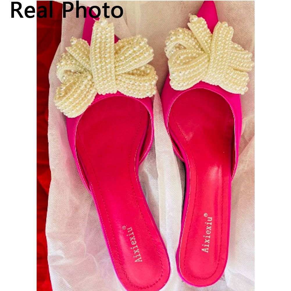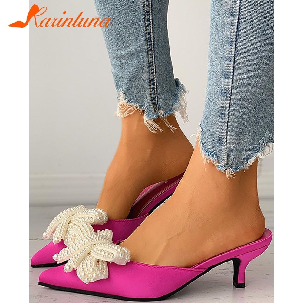 1X Karinluna 2022 New Fashionable Woman Mules Shoes Pearl Slip-on Low Heels Pointed Toe Ladies Pumps fly-knot Woman Shoes