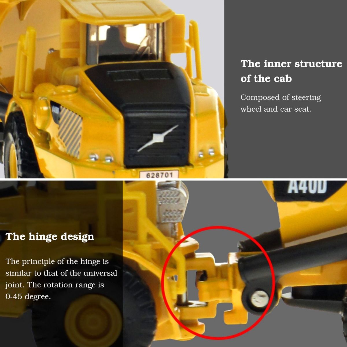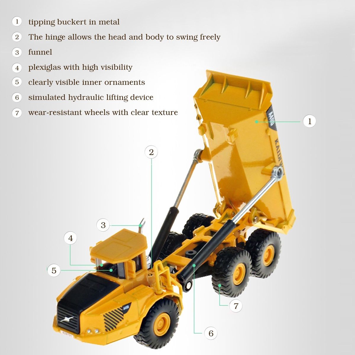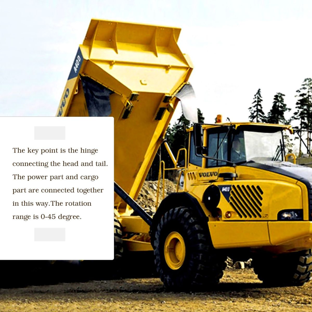 Hydraulic lifting device: Two hydraulic lifting devices can uphold the tipping bucket, which is flexible and highly simulated.