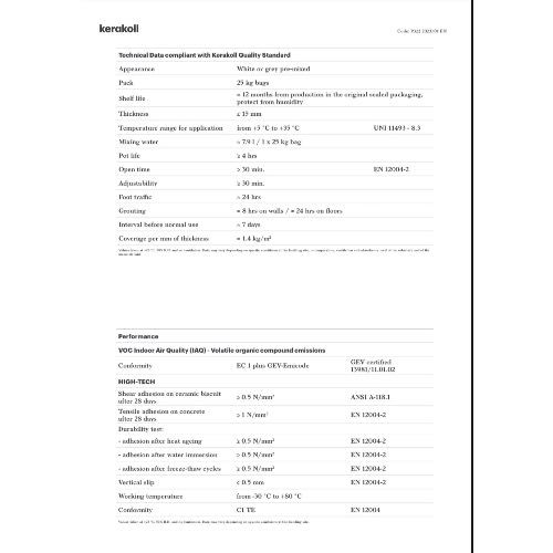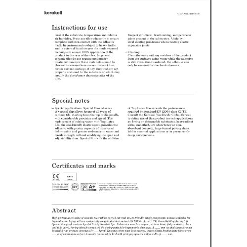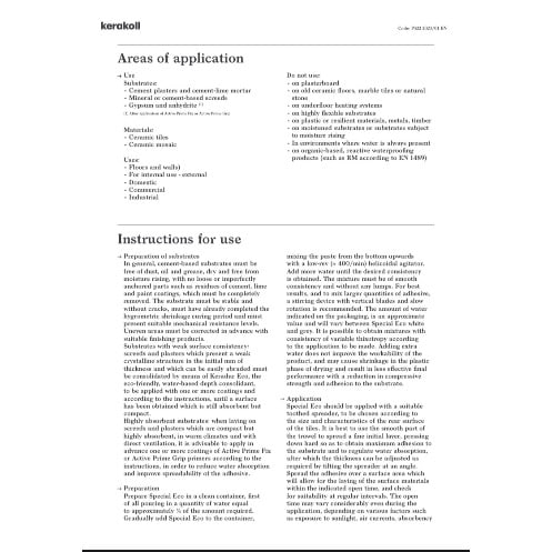 Special Eco has no vertical slip and develops a long adjustability time guaranteeing the laying of diagonal, top-to-bottom ceramic coverings, even at high thicknesses.1. Floors and walls, for internal and external use2. Thicknesses up to 15 mm3. Open and adjustability time & ge; 30 min.4. No vertical slip5. Suitable for laying single and double- fired ceramic tiles on mineral or cement-based substrates