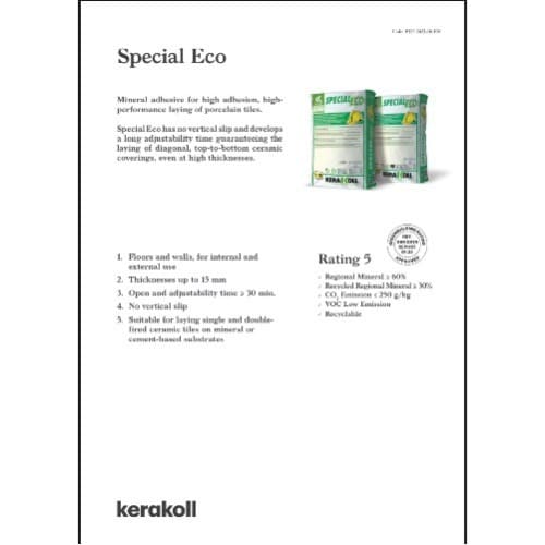 Special Eco has no vertical slip and develops a long adjustability time guaranteeing the laying of diagonal, top-to-bottom ceramic coverings, even at high thicknesses.1. Floors and walls, for internal and external use2. Thicknesses up to 15 mm3. Open and adjustability time & ge; 30 min.4. No vertical slip5. Suitable for laying single and double- fired ceramic tiles on mineral or cement-based substrates