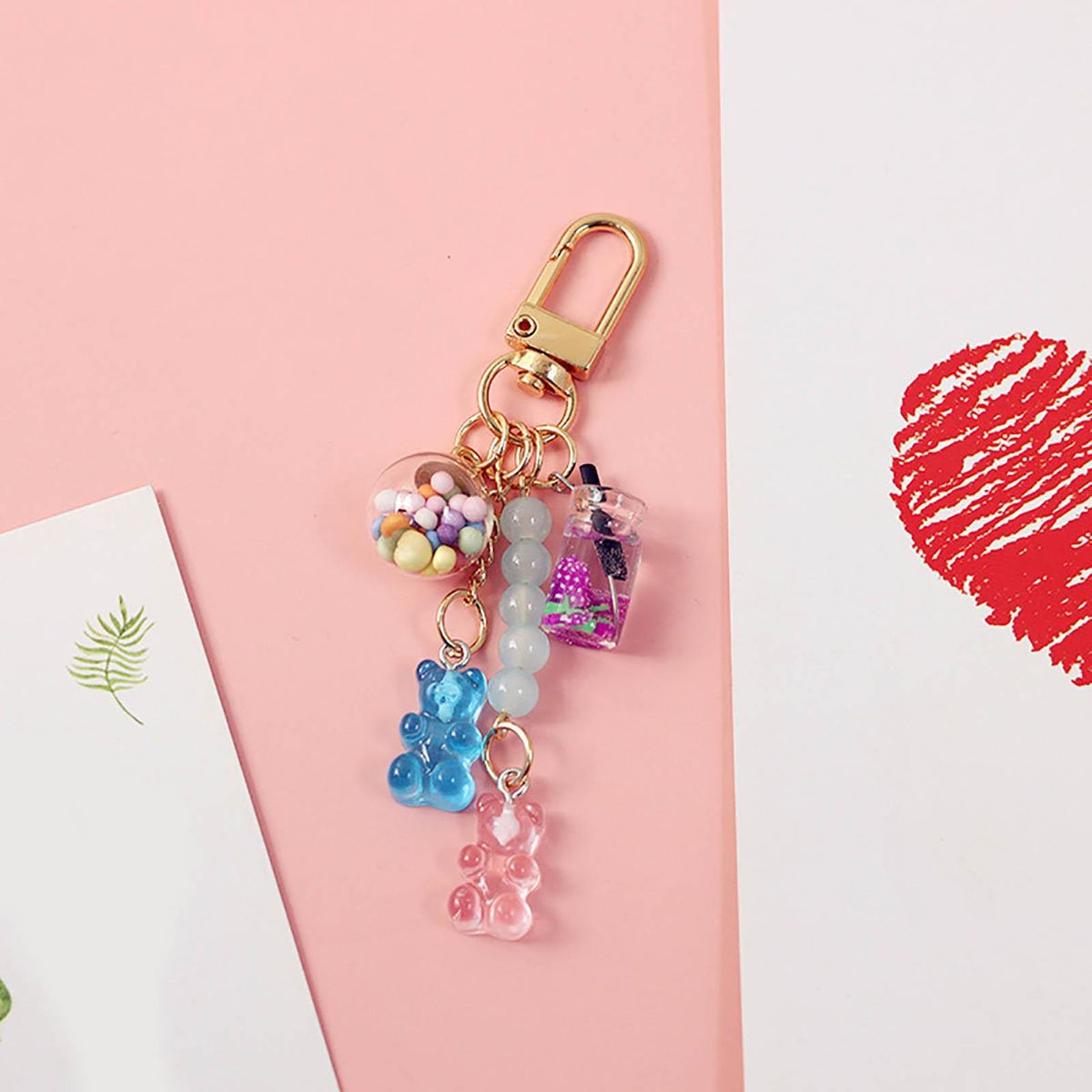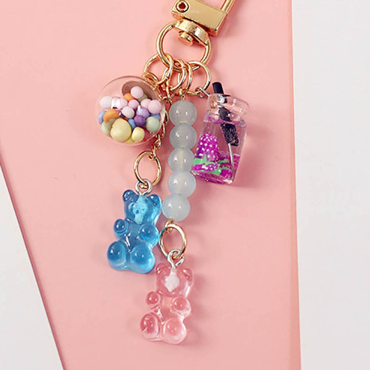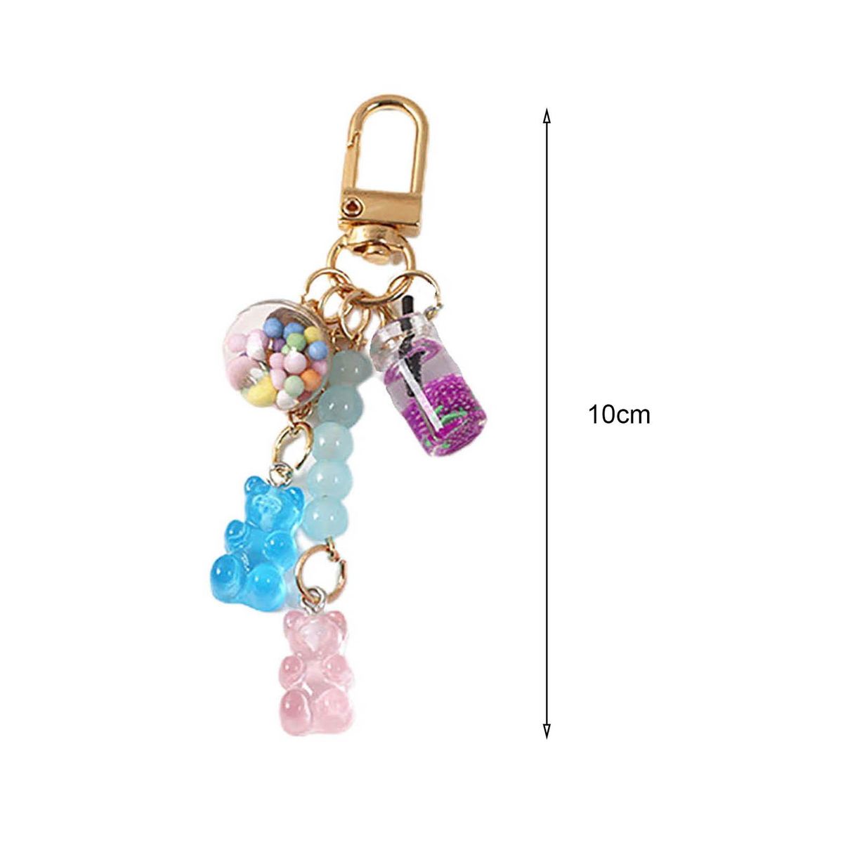 Designed with cartoon gummy bear, beverage model and beads, this key chain can make your items look more fashionable and cute.