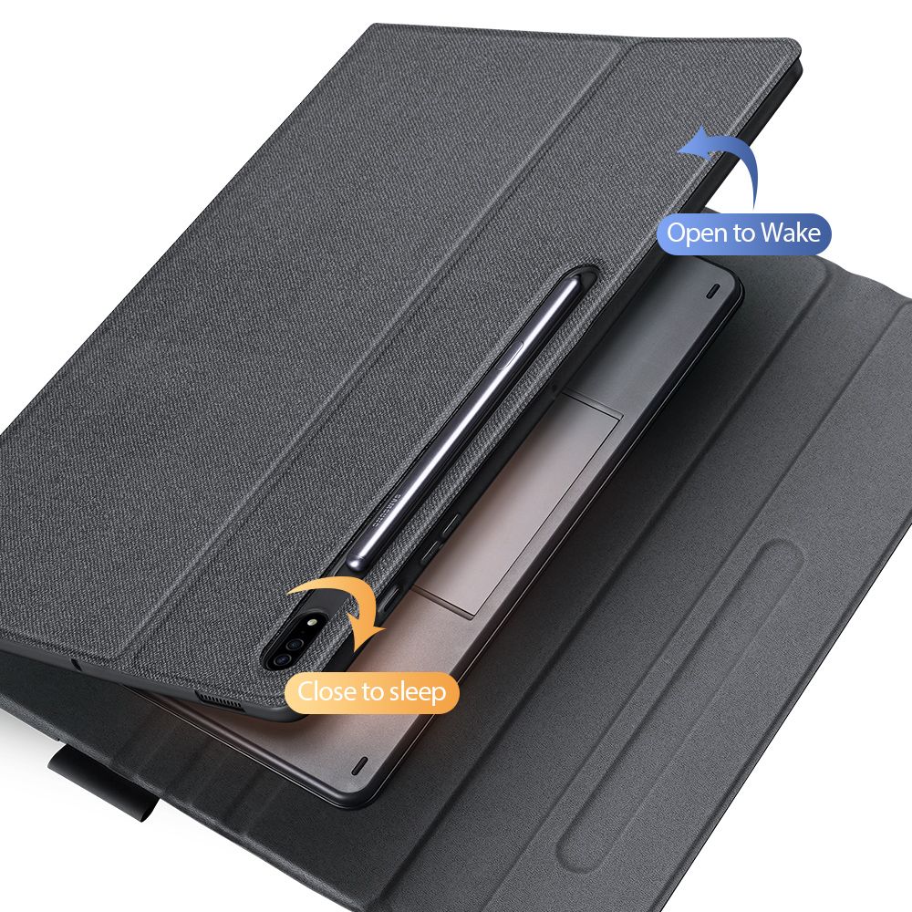 Samsung Galaxy Tab S8 Ultra! This case comes with a detachable bluetooth keyboard that seamlessly connects with the tablet for a quicker and more comfortable typing. A spring mechanism underneath each key ensures a tactile response with every stroke, helping you to type faster and with less error than on a touchscreen. Smart slim design adds maximum protection with minimal bulk (0.38 in). Find the angle in landscape mode just right for you with the adjustable stand that customizes to your personal viewing preference. All features of the tablet are accessible even with the case on. This versatile and protective case from Fintie features a removable keyboard that lets you switch between work and play with ease anywhere you use your tab.