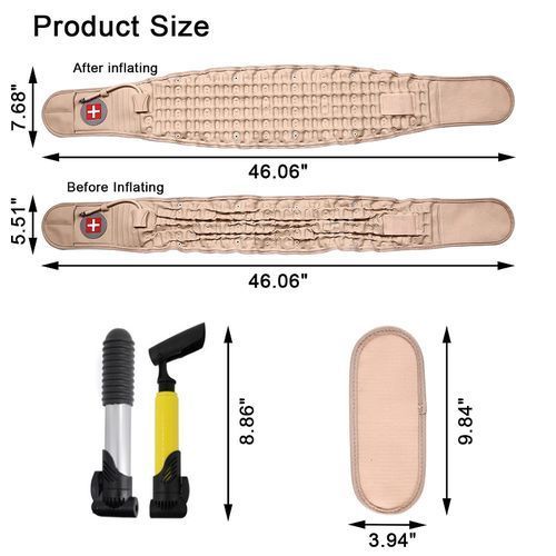 Item can be used for: 1. Prolapsed lumbar intervertebral discs.2. Abnormal function of small joints of the lumbar vertebra.3. Hyperplasia of lumbar vertebra.4. Strenuous jobs requiring heavy lifting.5. Long time driving or sitting.6. Scoliosis and spondylolisthesis.7. Low back pain caused by obesity.8. Degenerative discs.Advantages:1. The belt transfers the weight off your spine.2. Decompressing the spine allowing for discs to return to normal.3. Reducing pain and pressure on pinched nerves.4. Improving nutrient flow on your spine.5. Aids in strengthening your core and back muscles.Use direction: Wearing the belt against the skin directly or on loose fitting clothing,Wearing the belt between the lower rib cage and hip, attaching the belt firmly,Clip pump onto the gas valve of the belt, and then inflate the belt by pumping the pump,The most effective traction effect is obtained when the air pillars of belt are fully inflatedIt is recommended that initially the belt be worn for 30-60 minutes at a time. if not side effect or pain is experienced then the usage time can be periodically extended.SPECIFICATION:Item Type: Braces & SupportsEffect: Release Pain From IllnessFunction: Back Brace SupportItem: Back Support BeltFeature: Health Care,Body Healthcare Massage,Waist Support Belt,Waist Brace,Lumbar traction beltsolution for solve using problemColour: Khaki,BlueOuter layer: PUInner layer: cottonInner layer of air inflation: TPUBefore Inflation Width: 13cm (5.1 inch) After Inflation Width: 20cm (7.9 inch) Length of extension belt: 25.0cmPackage Including:1 x Traction Belt1 x Hand Air Pump1 x Extend Belt1 x Use ManualNote: Light shooting and different displays may cause the color of the item in the picture a little different from the real thing. The measurement allowed error is +/- 1-3cm.