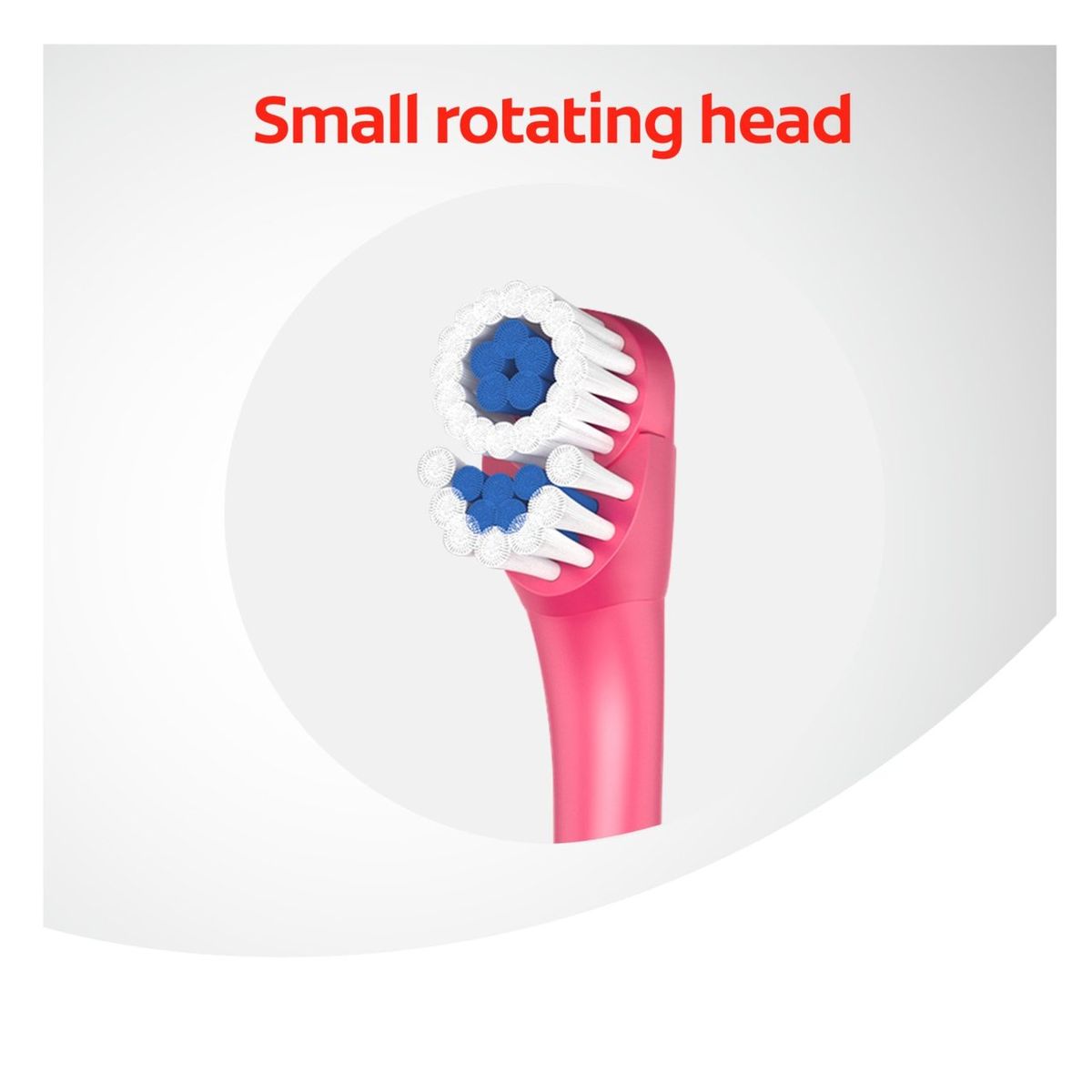 Small Vibrating head with extra soft bristles: Cleans teeth by gently sweeping away plaque.