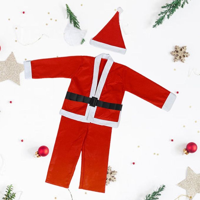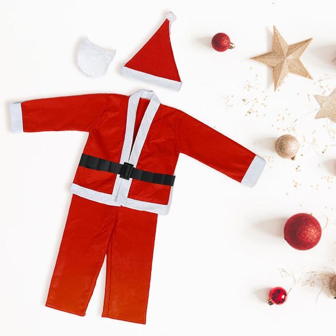 5 Piece Santa Suit includes: Red plush Santa coat, Pants, Santa Hat, Belt with Buckle,Beard.