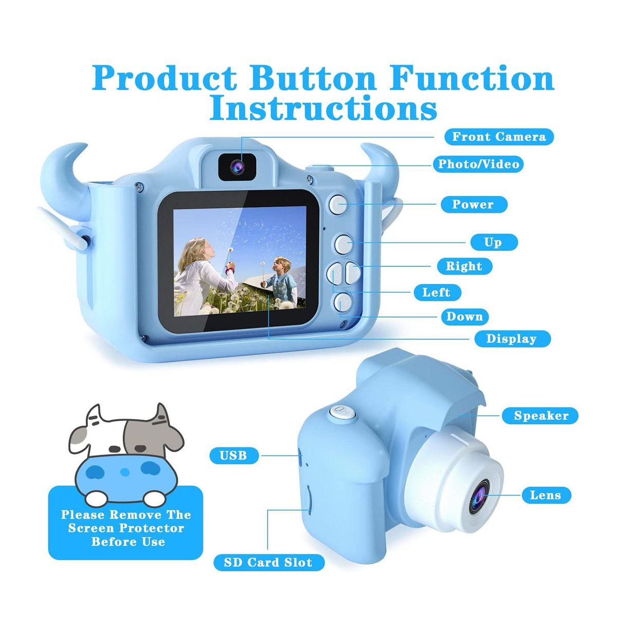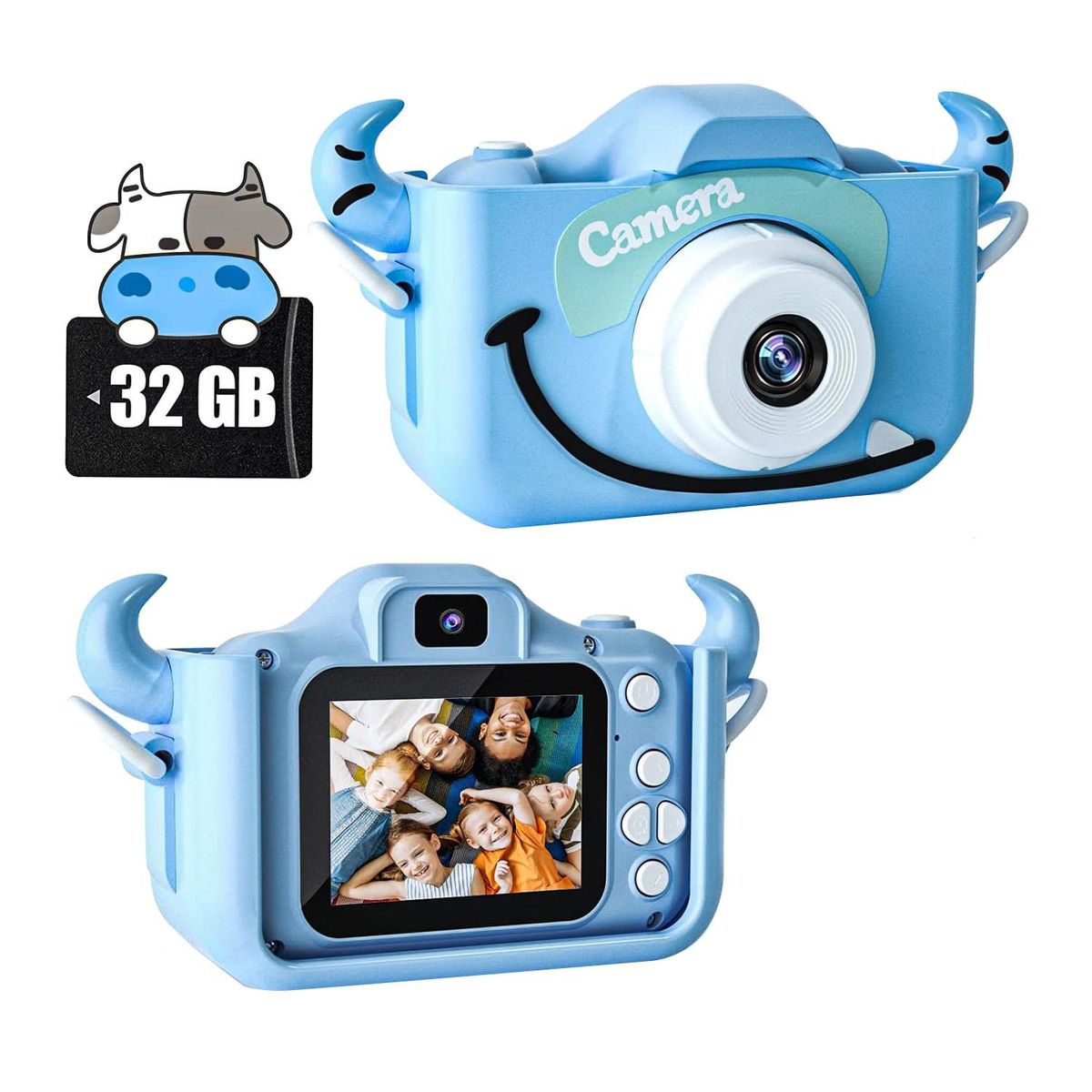 [Built-in lithium battery, USB rechargeable kids camera and 32G SD card]Built-in 1000mAh rechargeable lithium battery, can take photos or videos for 3 hours. Take it with you wherever you go and capture the best moments. Connect to computer via USB cable to transfer photos/videos, or charge toddler cameras. Also comes with a 32G SD card that can store thousands of photos. No need to worry about running out of storage space!
