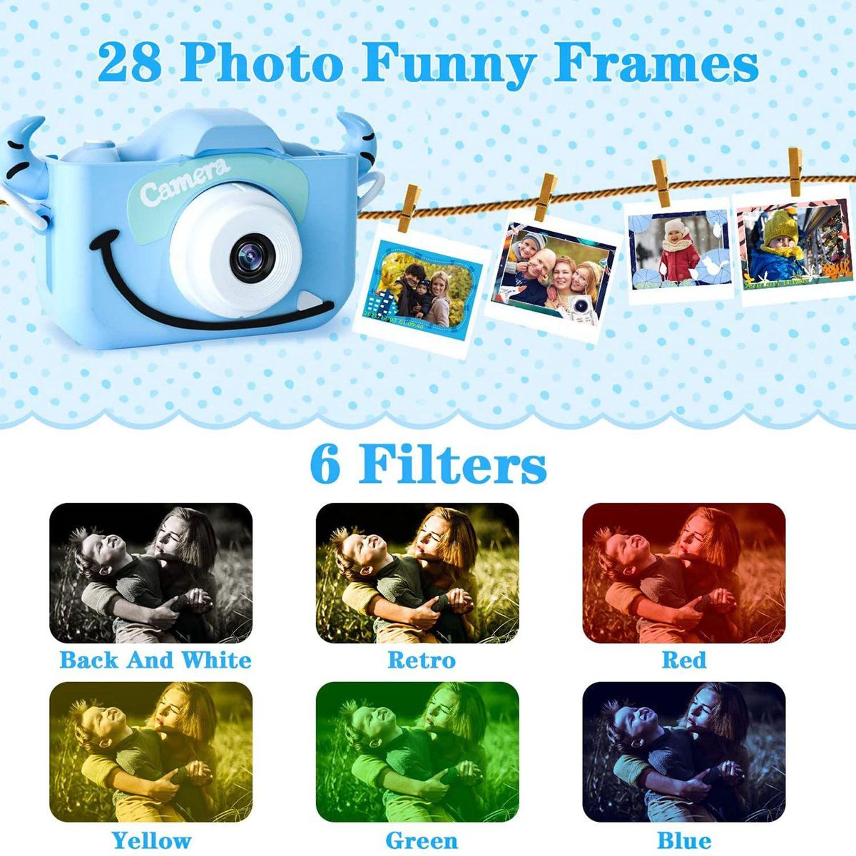 [Multiple Functions, Play with Small Palms]Kids Camera has 28 cartoon sticker photo frames and 6 filters. At the same time, it is also equipped with functions such as Selfie, video, playback, recording, and puzzle. This kids camera has HD lenses on the front and back with HD IPS eye protection screen to avoid hurting your child's eyesight. Children can better document their childhood trajectories and capture memorable moments.