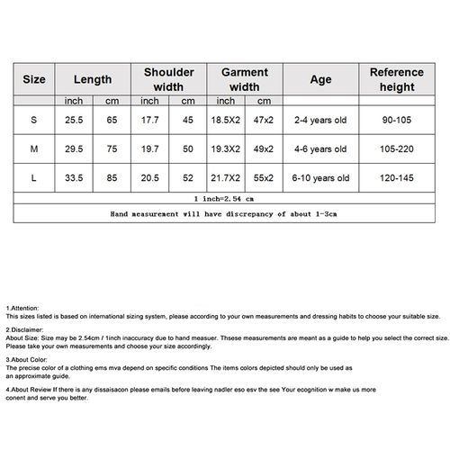 Size: Size S Raincoat length 84 cm,Sleeve 41 cm,Chest 80 cm,Suitable for children height 85-100 cm Size M Raincoat length 95 cm,Sleeve 46 cm,Chest 84 cm,Suitable for children height 101-115 cm Size L Raincoat length 109 cm,Sleeve 50 cm,Chest 92 cm,Suitable for children height 116-135 cm