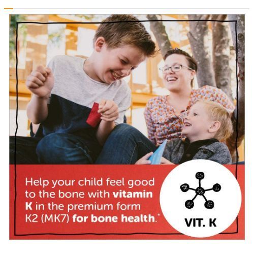 Vitamin K With vitamin K, in the premium form K2 (MK7), your child can feel good to the bone. It helps their body utilize calcium and magnesium from their diet to support strong bones.*