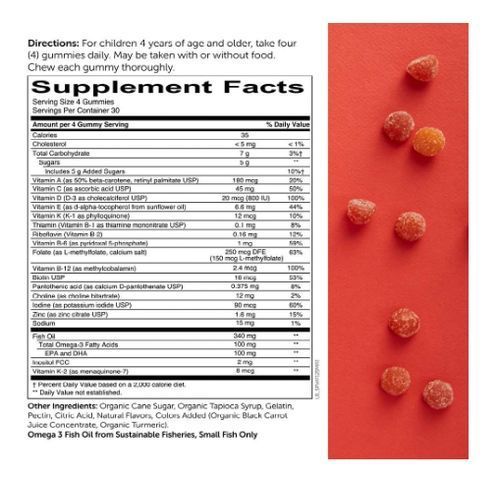 Multivitamin gummies for kids with omega-3 EPA & DHA (essential fatty acids) sustainably sourced from wild-caught small fish.