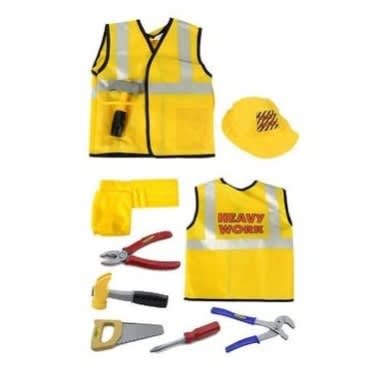 Realistic nylon vest, hat and tool belt.Includes hammer, saw, pliers and screwdriver