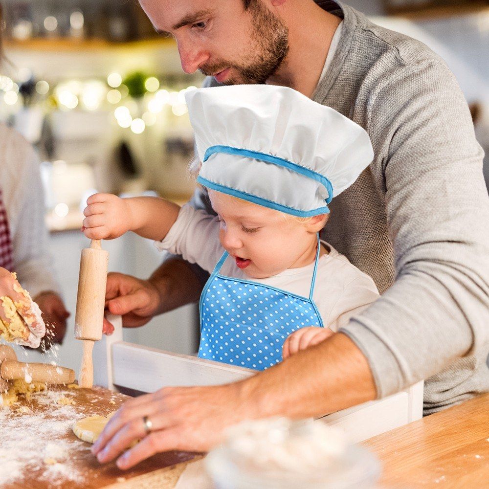 Boys can dress themselves as a professional cook in the kitchen with chef hat, apron and oven mitt.