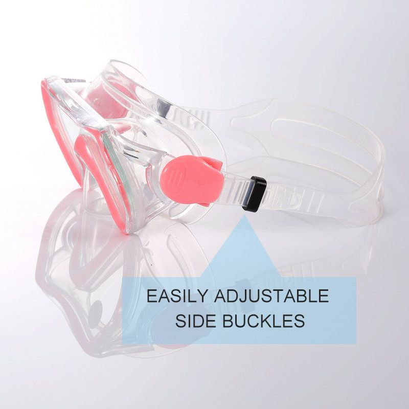 EASILY ADJUSTABLE SIDE BUCKLES - Our diving glasses fits to users with heads in different sizes. It has the easily adjustable side buckles so that you can adjust it to make the silicone skirt closely fit to your face.