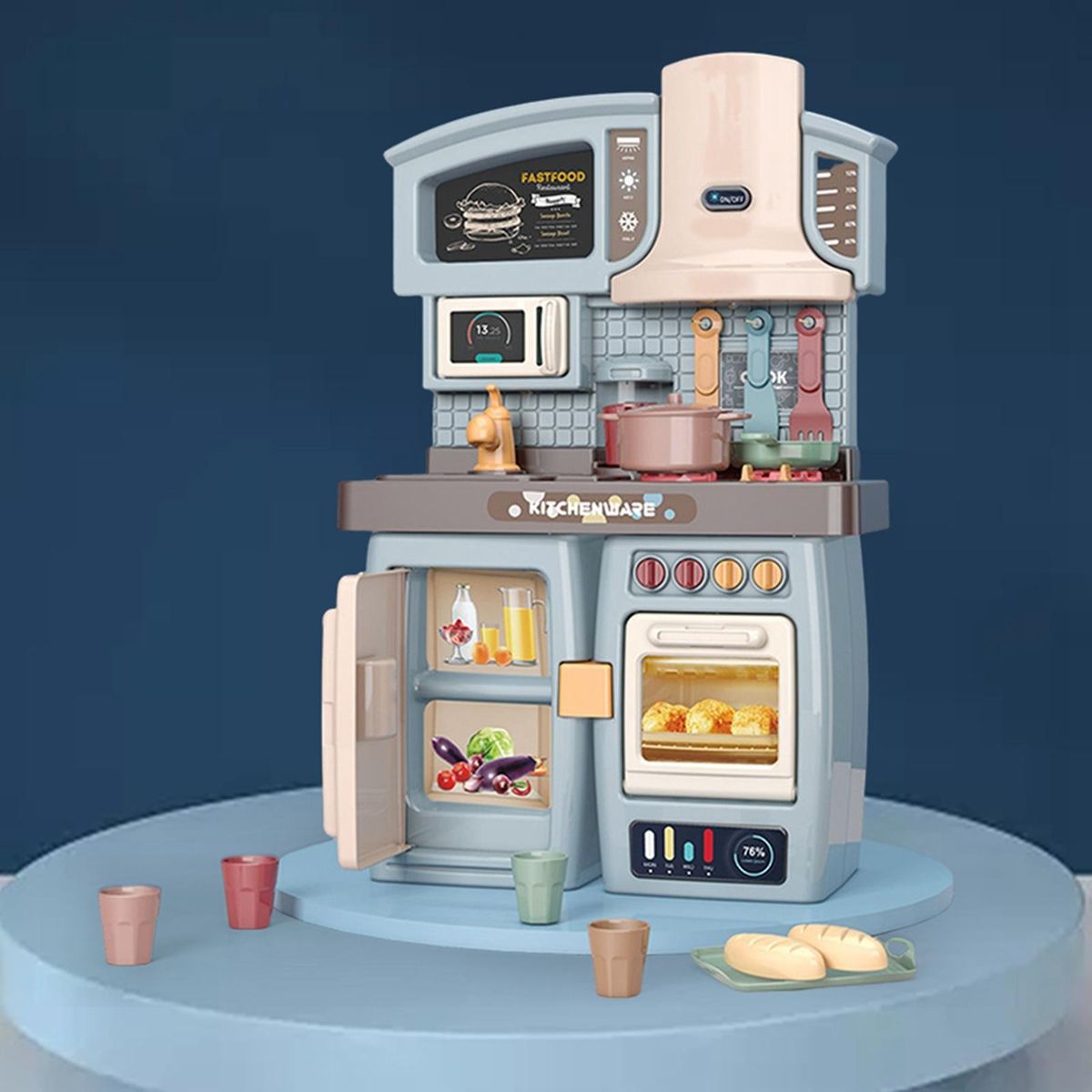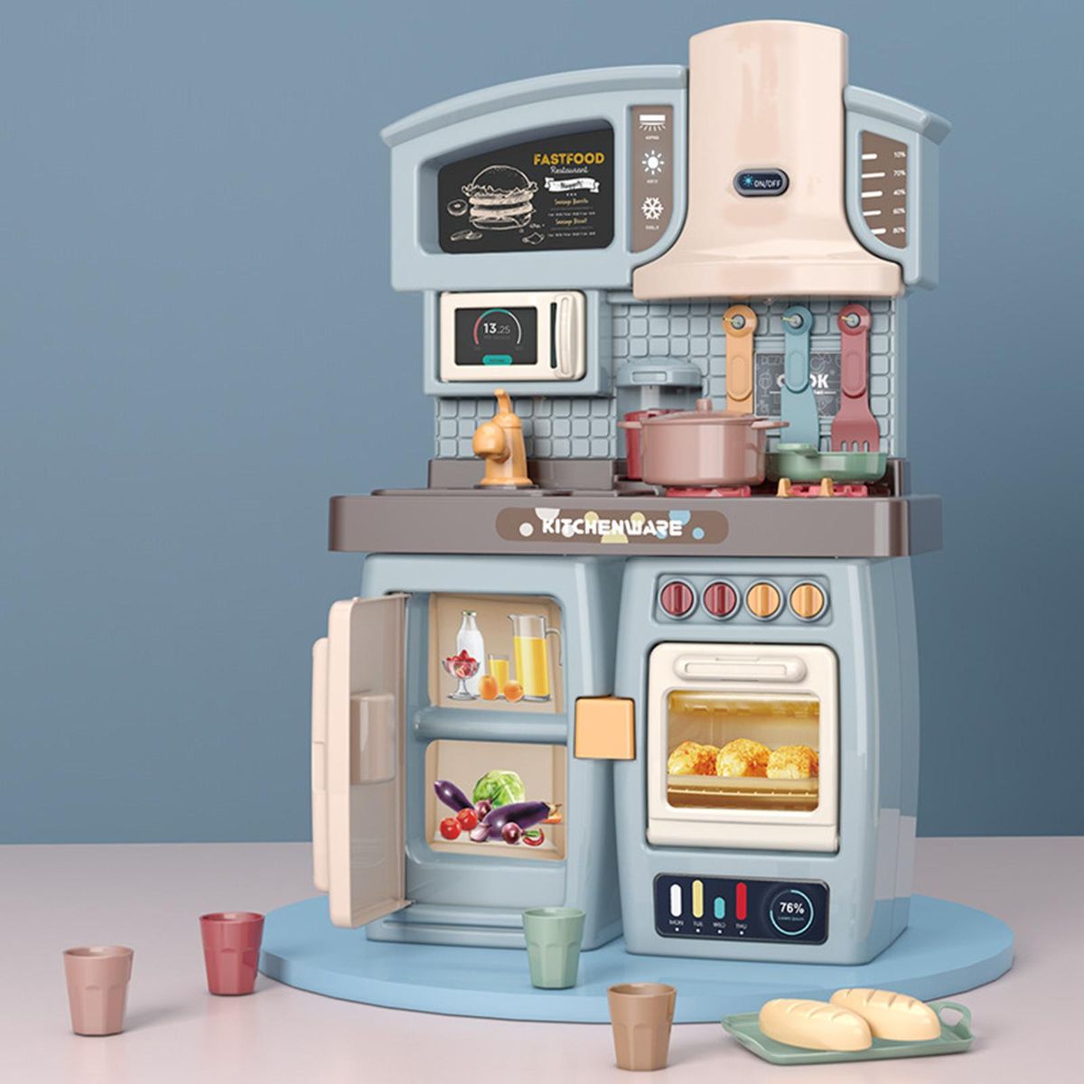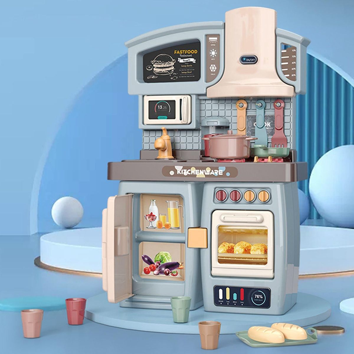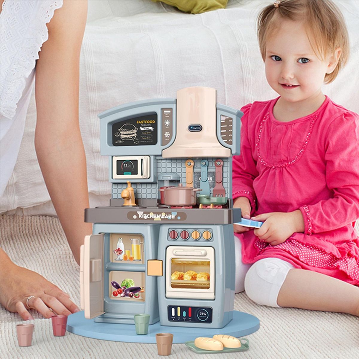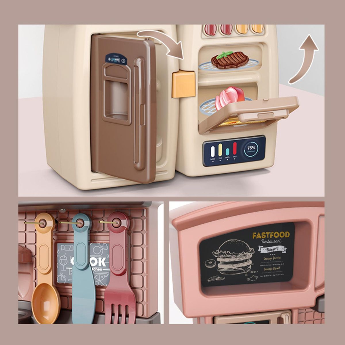Kids Kitchen Playset: Kids Kitchen cooking play set, Two kinds of mounting type, it depends on your preference. Including mini smoking machine/food locker/shelving/microwave/double oven/fridge,various of kitchen appliances, practical toys for boys and girls.