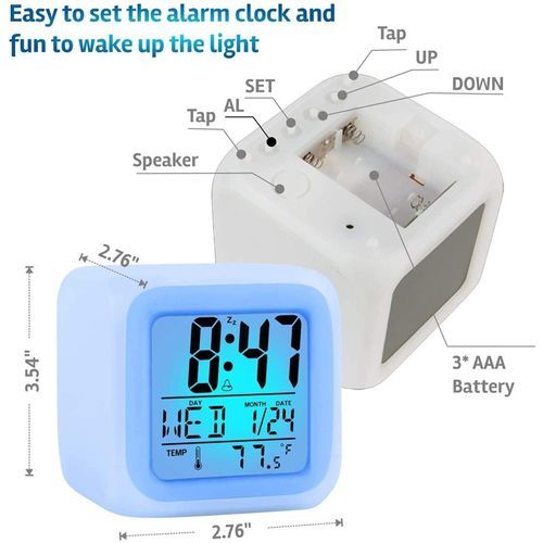 - CHILDREN'S BEDROOM NIGHT LIGHT - This small battery alarm clock emits 7 colors of light. Support automatic light switching between yellow, red, purple, blue, indigo, green and cyan. Light is warm and natural, creating a romantic night for your child. Let our bedroom clock night light accompany your child to get rid of the darkness.
