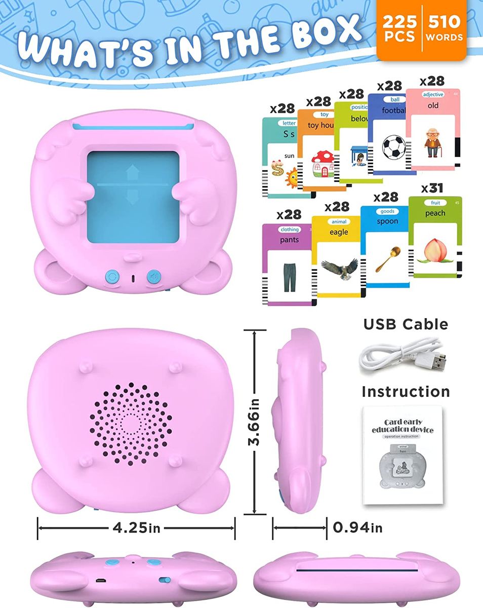 [ Children Learning Toys ] - This speech therapy toy includes a card reader and 224 card content -112 double sided flash cards covering 12 subjects like shapes, colors, animals, daily necessities, transports, food, fruits, vegetables, costumes, nature, persons & jobs. Great learning toy for 2 -8years year olds and up to learn sight words, enhance cognitive ability, exercise hearing and build vocabulary. Great autism sensory toys for autistic children.