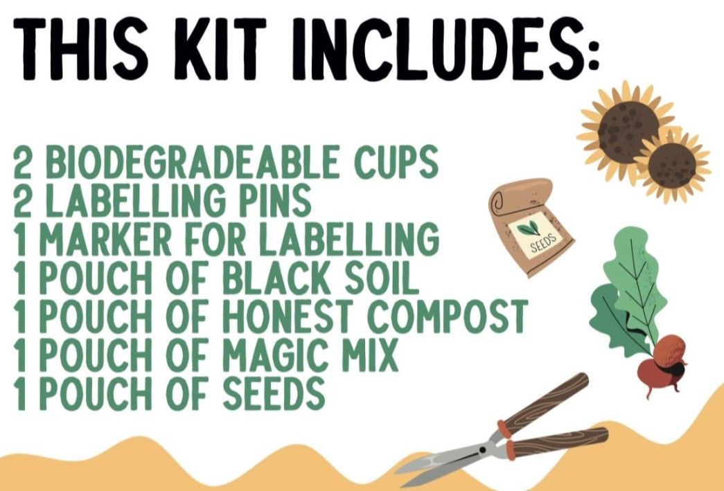 Kit includes:2 Biodegradable Pots, 2 Labels, 1 Marker, 1 Pouch of black soil, 1 Pouch of honest compost, 1 Pouch of magic mix, 1 Pack of seeds