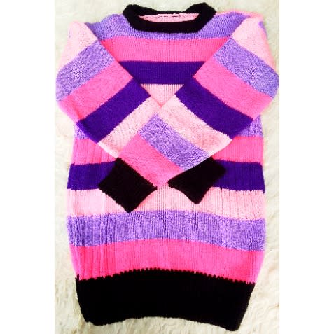 This is a round-neck long-sleeved multi-coloured sweater to give your child that adorable, beautiful, and classy look. Suitable for any occasion or event. This is made with different colours of yarn namely: Pink, Purple, Lilac, and Black. Suitable for ages 4 - 5 years.