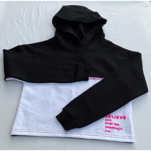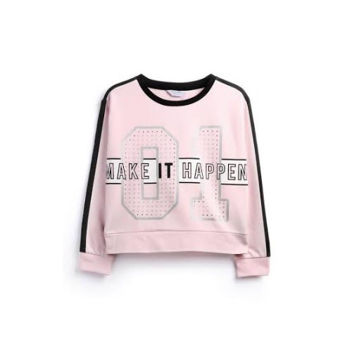 Make it happen top is soft sweatshirt fabric with a text print, ribbing at the side. Long sleeves top. Soft brushed inside.and decorated with white stones,