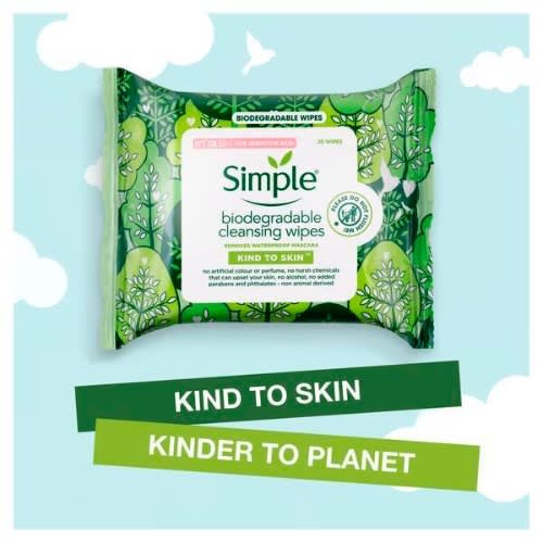 The Simple face wipes you know and love, now biodegradable. Kinder to the planet and yet merciless on makeup - our Simple Kind to Skin Biodegradable Cleansing Wipes act as a gentle cleanser and an effective make-up remover, even for waterproof mascara.