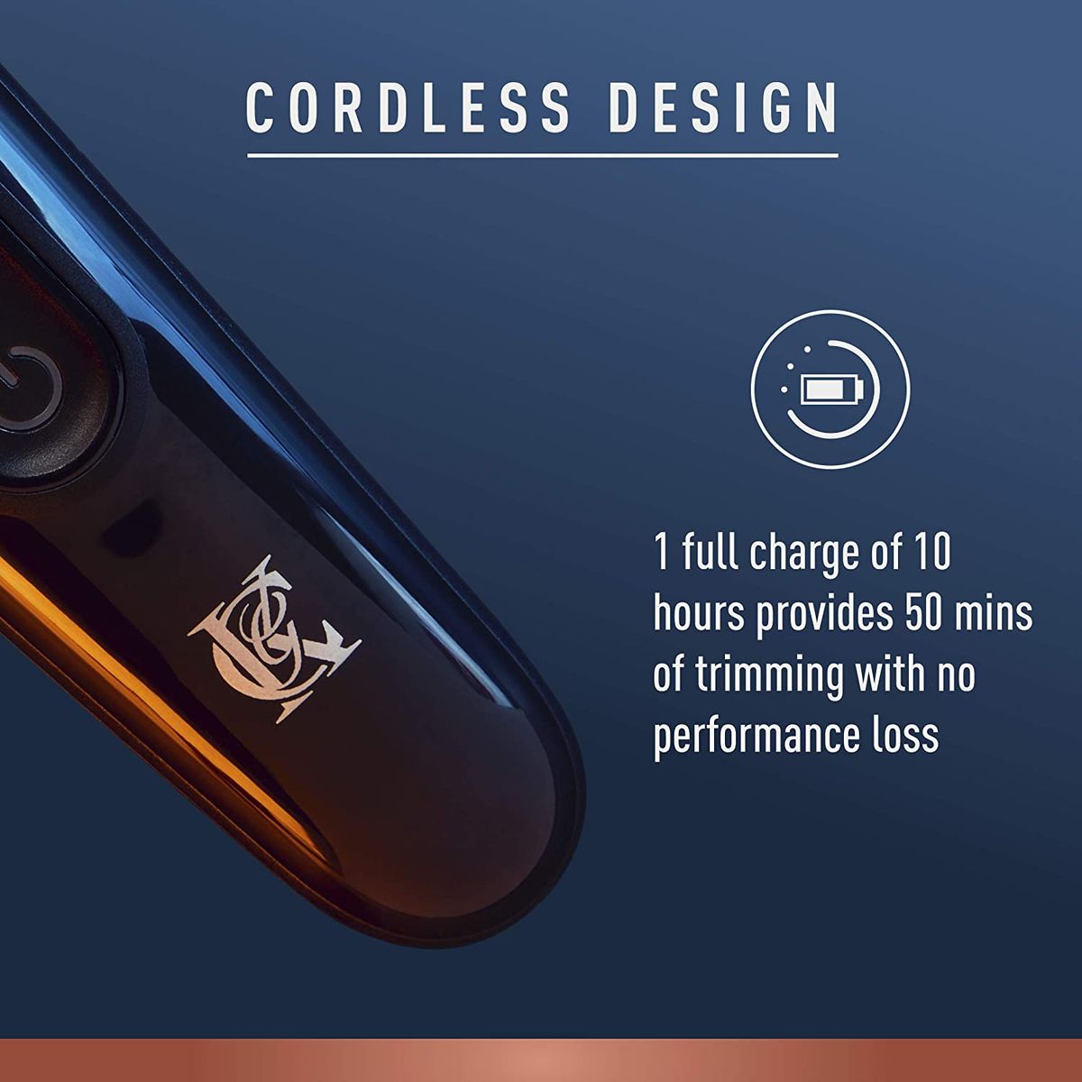 Cordless design. Rechargeable battery providing 50 minutes of trimming time per charge with no performance loss