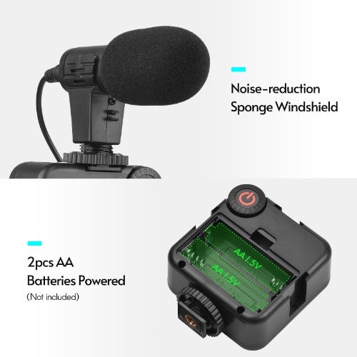 Smartphone Video Rig Kit with Light 49R LED Light: 49pcs lamp bead provides the light 6000K color temperature and 5W output power, powered with 2pcs AA batteries(not included), for brighter and uniform video lighting.
