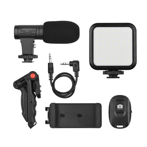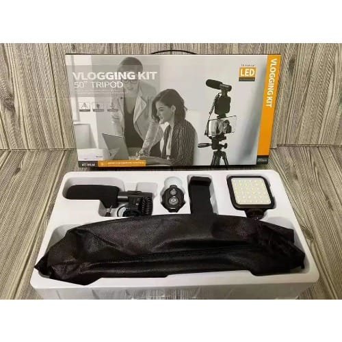 Vlogging kit is designed to enhance your videos with better sounds and lighting either indoors or outdoors. It features a universal microphone to work on any smartphone or camera, a LED light which features super bright light and also a 50 inches tripod stand