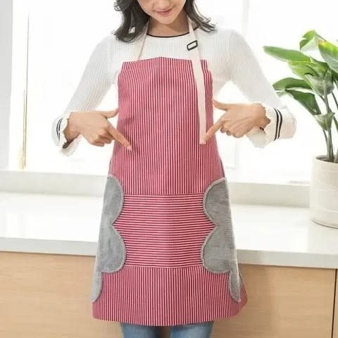 the waterproof kitchen apron has been stitched with two coral fleece absorbent towel on both sides so you can wipe your hands on it conveniently when there is an important phone call or a message you have to answer.