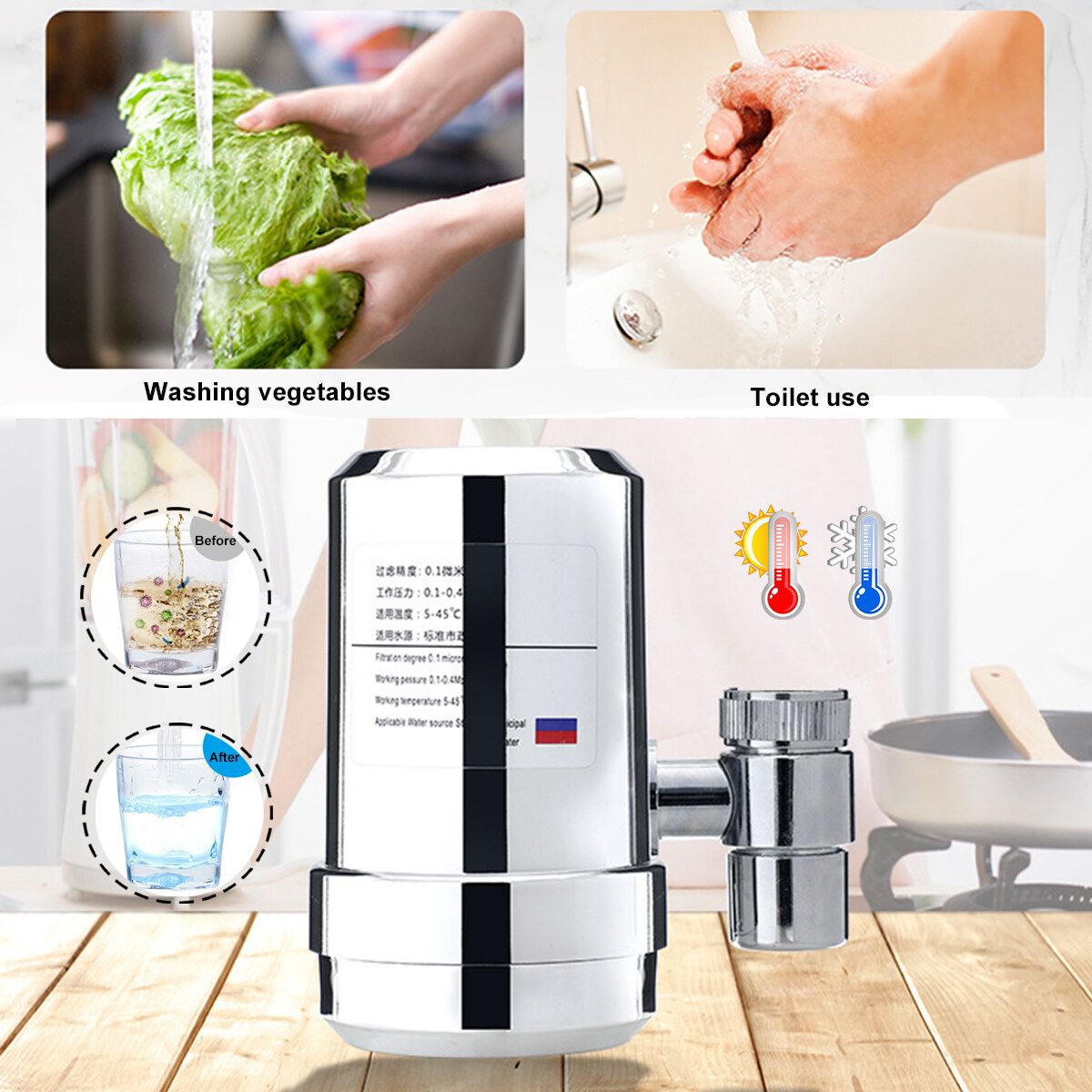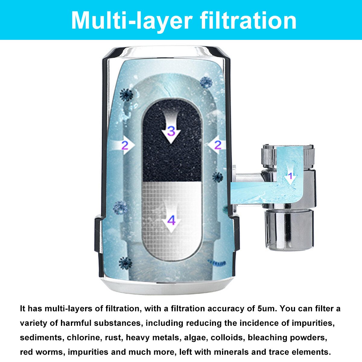 - Our tap water filtration system uses an advanced filtration system tested and pr0ven to improve the taste and quality of water. It has multi-layers of filtration, with a filtration accuracy of 5um. You can filter a variety of harmful substances, including reducing the incidence of impurities, sediments, chlorine, rust, heavy metals, algae, colloids, bleaching powders, red worms, impurities and much more, left with minerals and trace elements. It provides safe and healthy drinking water for washing dishes, cooking and drinking, and clean water for washing your face and brushing your teeth.