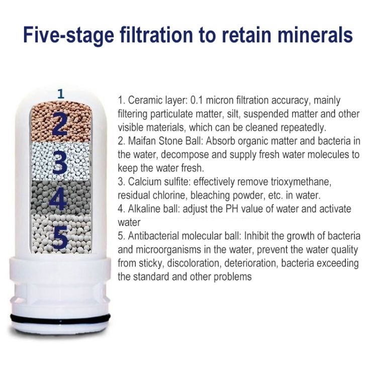 2. Filter element material: ceramic + antibacterial ball + calcium sulfite + medical stone ball + alkaline ball