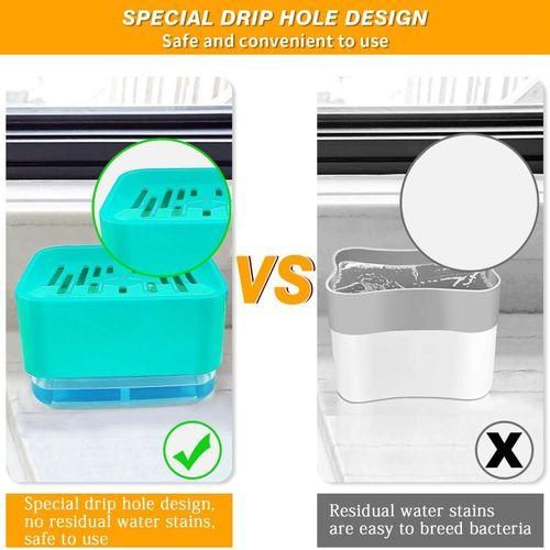 The dishwashing soap dispenser with hollow design can hold all sponges, scrubbers, rags, scouring pads, etc.
