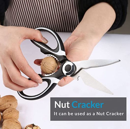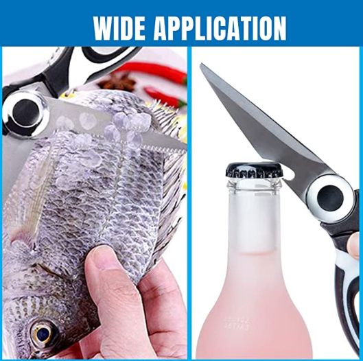 SUPER KITCHEN ASSISTANT MULTIFUNCTIONAL SCISSORSAdapt to a large number of kitchen work. It can cut meat, poultry, fish, vegetables etc. You can also use it to scrape fish scales, crack nuts, open bottles etc. Does not need chopping boards or choppers, making kitchen work more convenient. Has a micro-serrated edge for slip proof cutting, comfortable easy grip handles. Great grip for both right and left handed. Made of 3CR13 steel, this heavy duty scissors with ultra sharp blades are forged from top premium grade stainless steel that is rust- resistant and corrosion resistant. It is light and effortless while easily outperforming all other shears. The environmentally friendly material handle, stylish and anti-skid, is light and comfortable. The handle has stainless steel embedded in it making it solid and durable