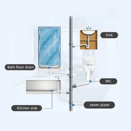 5. Scope of application: kitchen water pipes, toilets, bathrooms, floor drains, oil plugs, sewage immersed pipes and other drainage pipes.