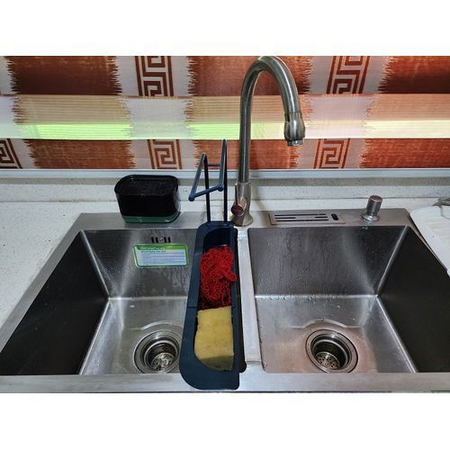 Kitchen Sink area organizer. Perfect hold for sponges, soaps, napkins and other sink working area items in a tidy and smart way. It is extendable and fits all types of kitchen sink. It is moderate in size and does not affect sink working space. It has water drain pores at the bottom that allows water to drain off through the sink. It is a perfect innovation for making kitchen convenient. This product has been a best seller because it makes the kitchen sink area neat, clean and tidy. Wet sponge drains off into the sink and it becomes dry in no time. The Napkin hanger is cute and effective. It does gives a perfect place to air dry napkins, hence dries in a short time. This product is made of very durable plastics and is guarranteed to last at least 10 years. The plastic material is at least 2mm thick.