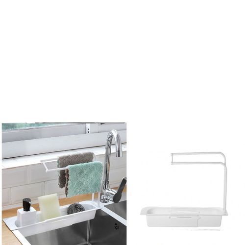 Kitchen Sink area organizer. Perfect hold for sponges, soaps, napkins and other sink working area items in a tidy and smart way. It is extendable and fits all types of kitchen sink. It is moderate in size and does not affect sink working space. It has water drain pores at the bottom that allows water to drain off through the sink. It is a perfect innovation for making kitchen convenient. This product has been a best seller because it makes the kitchen sink area neat, clean and tidy. Wet sponge drains off into the sink and it becomes dry in no time. The Napkin hanger is cute and effective. It does gives a perfect place to air dry napkins, hence dries in a short time. This product is made of very durable plastics and is guarranteed to last at least 10 years. The plastic material is at least 2mm thick.