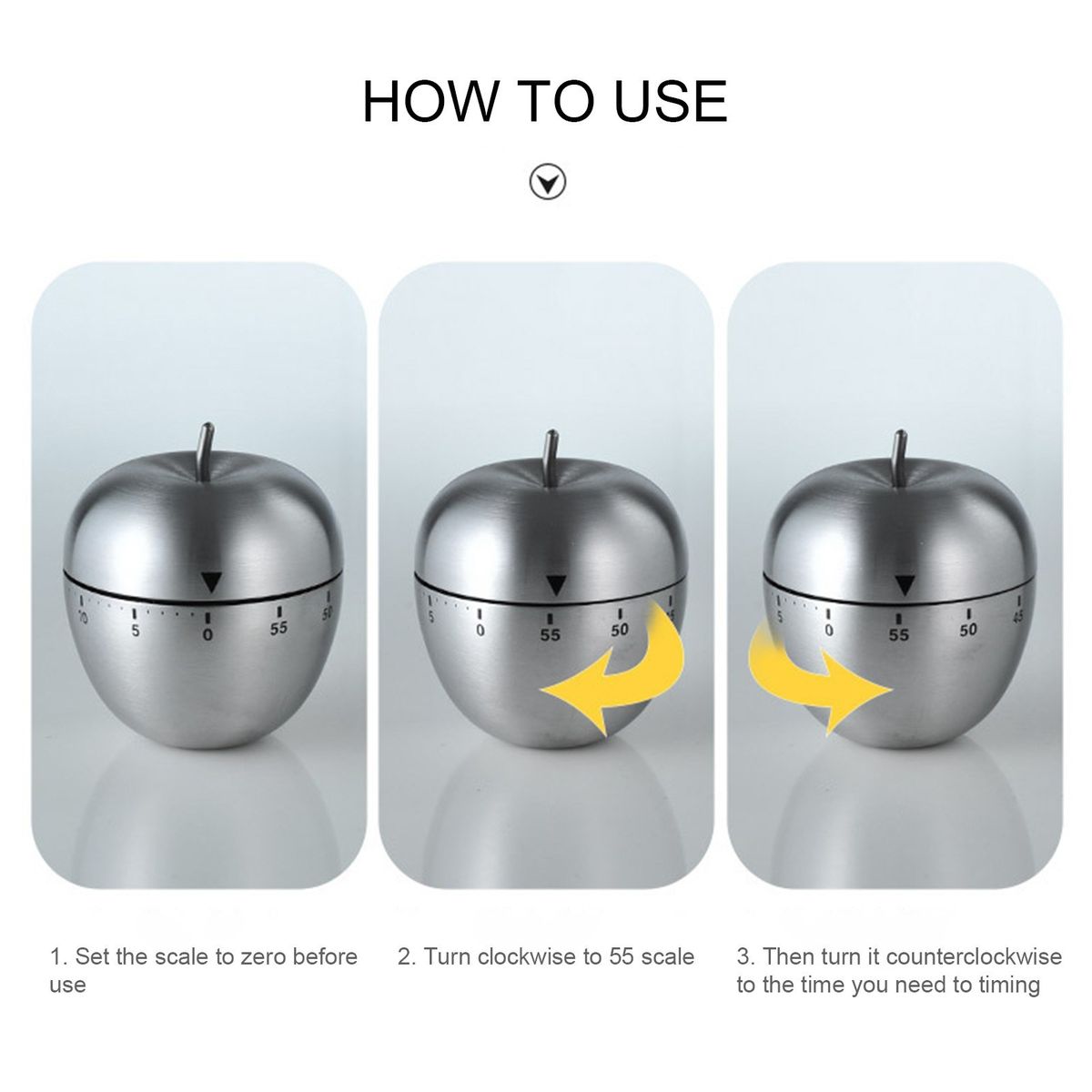 Just turn the kitchen timer clockwise all the way to 55 minutes, then turn it anti-clockwise to the time you want, like 20 minutes. Then the timer will ring after 20 minutes, you will hear it clearly. Manual dial to set timings of up to 60 minutes.