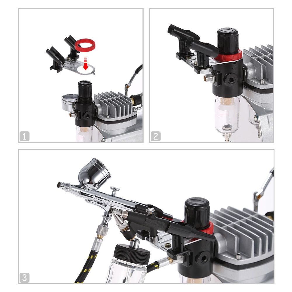 Perfect performance airbrush compressor with air pressure gauge, air filter, adjustable pressure, cleaning brushes and airbrush holder for 2 airbrushes.