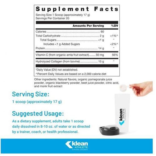 Being an athlete requires consistency and repetition, and, consequently, can result in normal wear, tear, and strain on our bones, joints, and connective tissues. As any athlete knows, being sidelined mid-season or just as you're starting to achieve those fitness gains and personal bests is never fun. Klean Collagen+C is a delicious natural berry drink mix that contains easily absorbable collagen peptides combined with naturally sourced vitamin C from organic amla fruit for joint and connective tissue support, to keep you in the game as much as possible. Research shows that supplemental collagen peptides help maintain cartilage health by promoting cartilage regeneration, and offer protection for connective tissue by supporting healthy collagen production. Vitamin C, in combination with the amino acids proline and glycine found in collagen, has been studied for its synergistic effects on the production of collagen after exercise. When your health, performance and mobility are on the line, give your body every asset it needs to crush that next workout and push back stronger day after day. Klean Collagen+C is your tool to do just that.*
