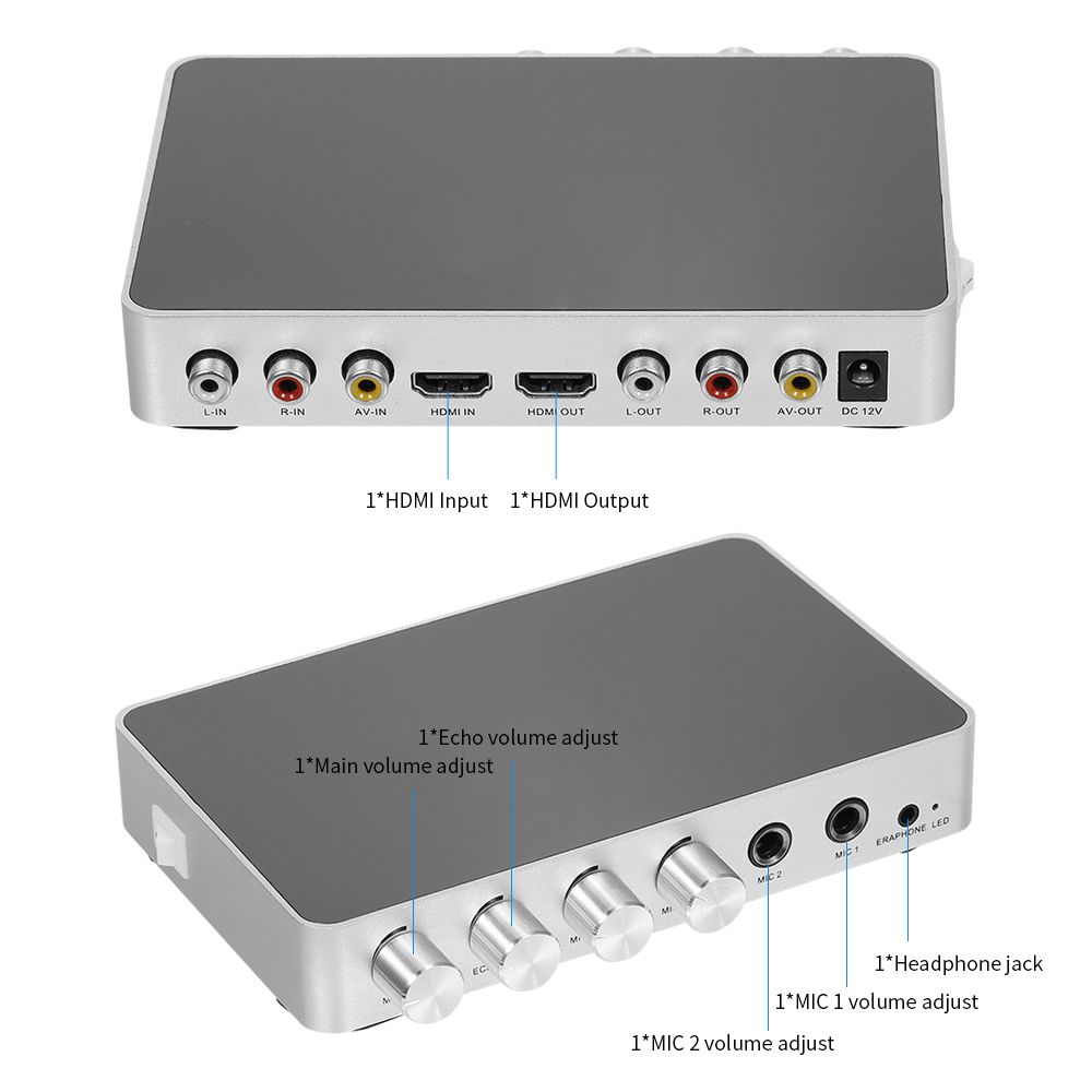 Karaoke HDMI mixer support mix audio from 2 different microphones and allow to adjust music volume, echo volume, individual microphone volume. Meanwhile, offering you a superior stereo audio quality.