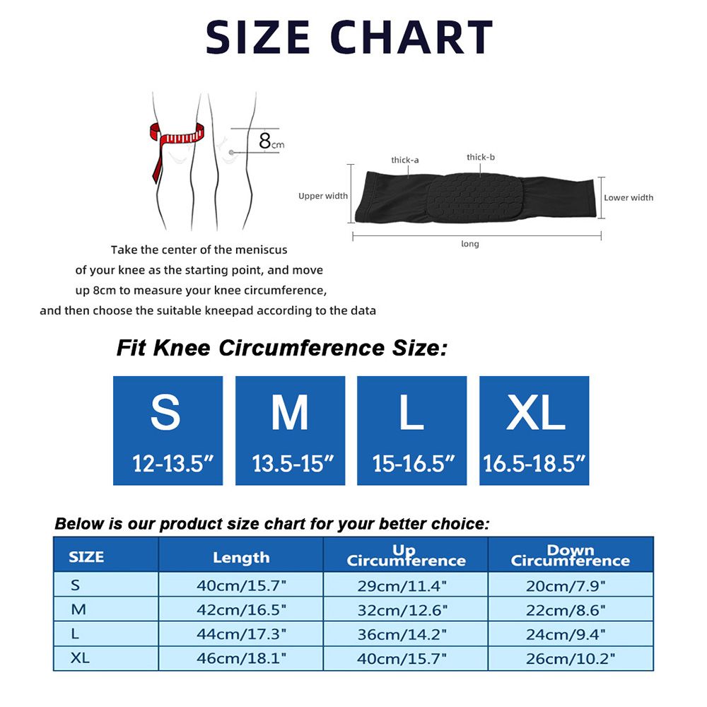 Size: S,M,L,XL (S fit for knee circumference size: 12-13.5 inches, M fit for knee circumference size: 13.5-15 inches, L fit for knee circumference size: 15-16.5 inches, XL fit for knee circumference size: 16.5-18.5 inches