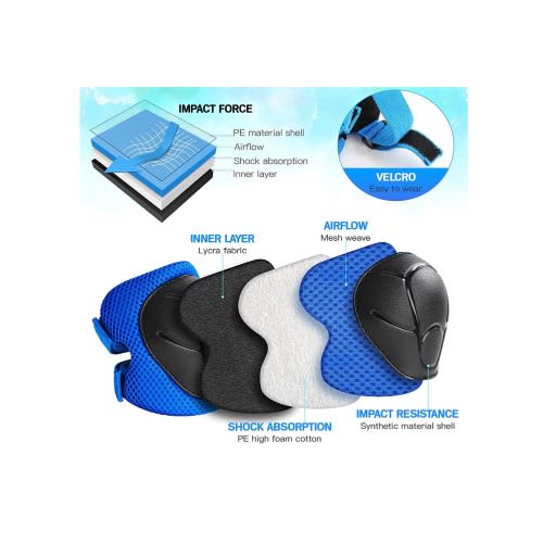 Wearing protective pads will never worry about the kids getting hurt when they play. Elbow, Knee and Wrist 6pcs a set, bring you all-round and perfect protection during sports. Suitable for skateboarding, inline skating, a scooter, bicycles and many other outdoor sports riding. Soft pillow pad on the insideSuitable Sport: Skateboard Rollerblade Bicycle Ride Bike Cycling BMX bike Mountain Bike Dirt Bike Scooter Other extreme outdoor or indoor sports which need impact resistant protective equipment.Suitable User: Knee pads and elbow pads for Unisex ChildrenS code: suitable for children over 6 years old and adults under 1.6 metersMaterial:Polyester+PP+plasticColour:black BluePackage Contents:1 x pair of elbow pads1 x pair of knee padsOnly the above package content, other products are not included.