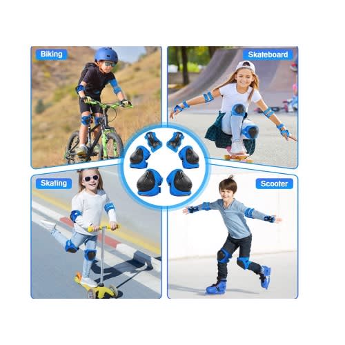 Wearing protective pads will never worry about the kids getting hurt when they play. Elbow, Knee and Wrist 6pcs a set, bring you all-round and perfect protection during sports. Suitable for skateboarding, inline skating, a scooter, bicycles and many other outdoor sports riding. Soft pillow pad on the insideSuitable Sport: Skateboard Rollerblade Bicycle Ride Bike Cycling BMX bike Mountain Bike Dirt Bike Scooter Other extreme outdoor or indoor sports which need impact resistant protective equipment.Suitable User: Knee pads and elbow pads for Unisex Children