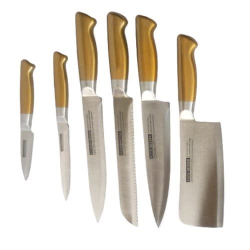 The Knife Set consists of the following: 1 Piece Serrated knife, 1 Piece Bread knife,1 Piece Carving knife, 1 Piece Chef knife,1 Piece Utility knife, 1 Piece Paring knife.