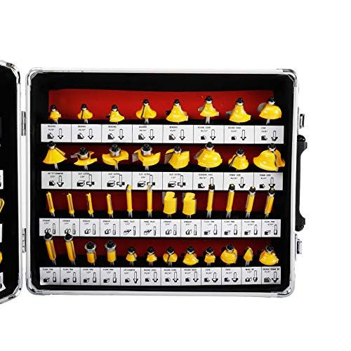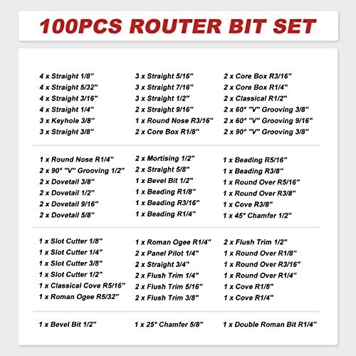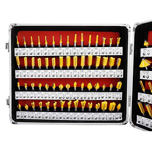 Details: Pakage inludes: 4 x Straight 1/8"4 x Straight 5/32" 4 x Straight 3/16" 3 x Keyhole 3/8" 3 x Straight 3/8"3 x Straight 5/16" 3 x Straight 7/16"3 x Straight 1/2" 2 x Straight 9/16"1 x Round Nose R3/16" 2 x Core Box R1/8" 2 x Core Box R3/16" 2 x Core Box R1/4" 2 x Clial R1/2" 2 x "V" Grooving 3/8" 2 x "V" Grooving 9/16" 2 x "V" Grooving 3/8"1 x Round Nose R1/4" 2 x "V" Grooving 1/2"2 x Dovetail 3/8" 2 x Dovetail 1/2" 2 x Dovetail 9/16" 2 x Dovetail 5/8" 2 x Mortising 1/2" 2 x Straight 5/8"1 x Bevel Bit 1/2" 1 x Beading R1/8" 1 x Beading R3/16" 1 x Beading R1/4" 1 x Beading R5/16" 1 x Beading R3/8" 1 x Round Over R5/16" 1 x Round Over R3/8" 1 x Cove R3/8" 1 x 45 Chamfer 1/2"1 x Slot Cutter 1/8" 1 x Slot Cutter 1/4" 1 x Slot Cutter 3/8" 1 x Slot Cutter 1/2" 1 x Clial Cove R5/16" 1 x Roman Ogee R5/32" 1 x Roman Ogee R1/4" 4 x Straight 1/4"2 x Panel Pilot 1/4" 2 x Straight 3/4"2 x Flush Trim 1/4" 2 x Flush Trim 5/16" 2 x Flush Trim 3/8" 2 x Flush Trim 1/2" 1 x 25 Chamfer 5/8" 1 x Round Over R1/8" 1 x Round Over R3/16" 1 x Round Over R1/4" 1 x Cove R1/8" 1 x Cove R1/4" 1 x Bevel Bit 1/2" 1 x Double Roman Bit R1/4" Aluminum arry ase