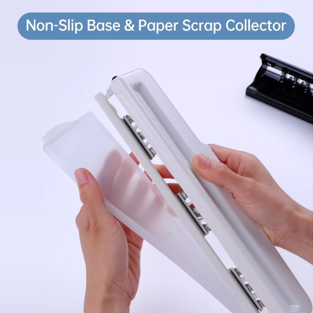 ▶ Made with a sturdy all-metal structure, this hole punch is built to last. It also features a flip-open plastic tray that collects paper scraps, as well as a non-slip base that protects your desktop.