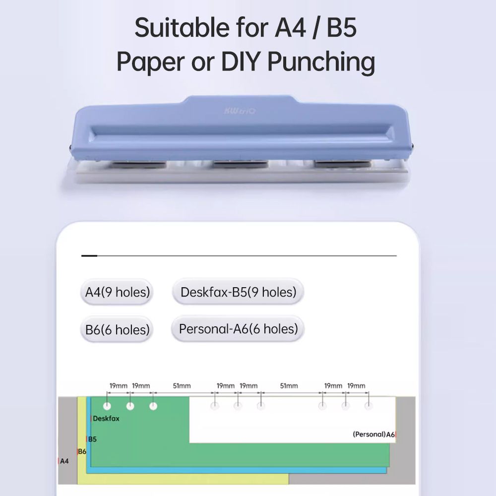 Features:▶ This hole punch is designed with a round shape and can punch up to 9 holes at once, making it ideal for use with loose-leaf notebooks.