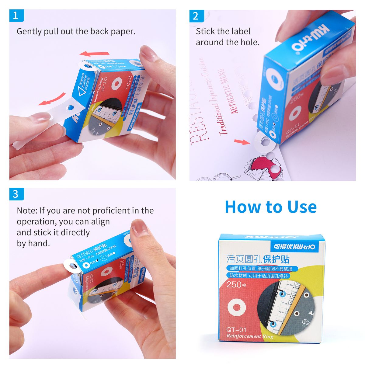 Features:Hole protection sticker for loose leaf paper, the paper is not easy to be damaged when turning over, convenient to use.